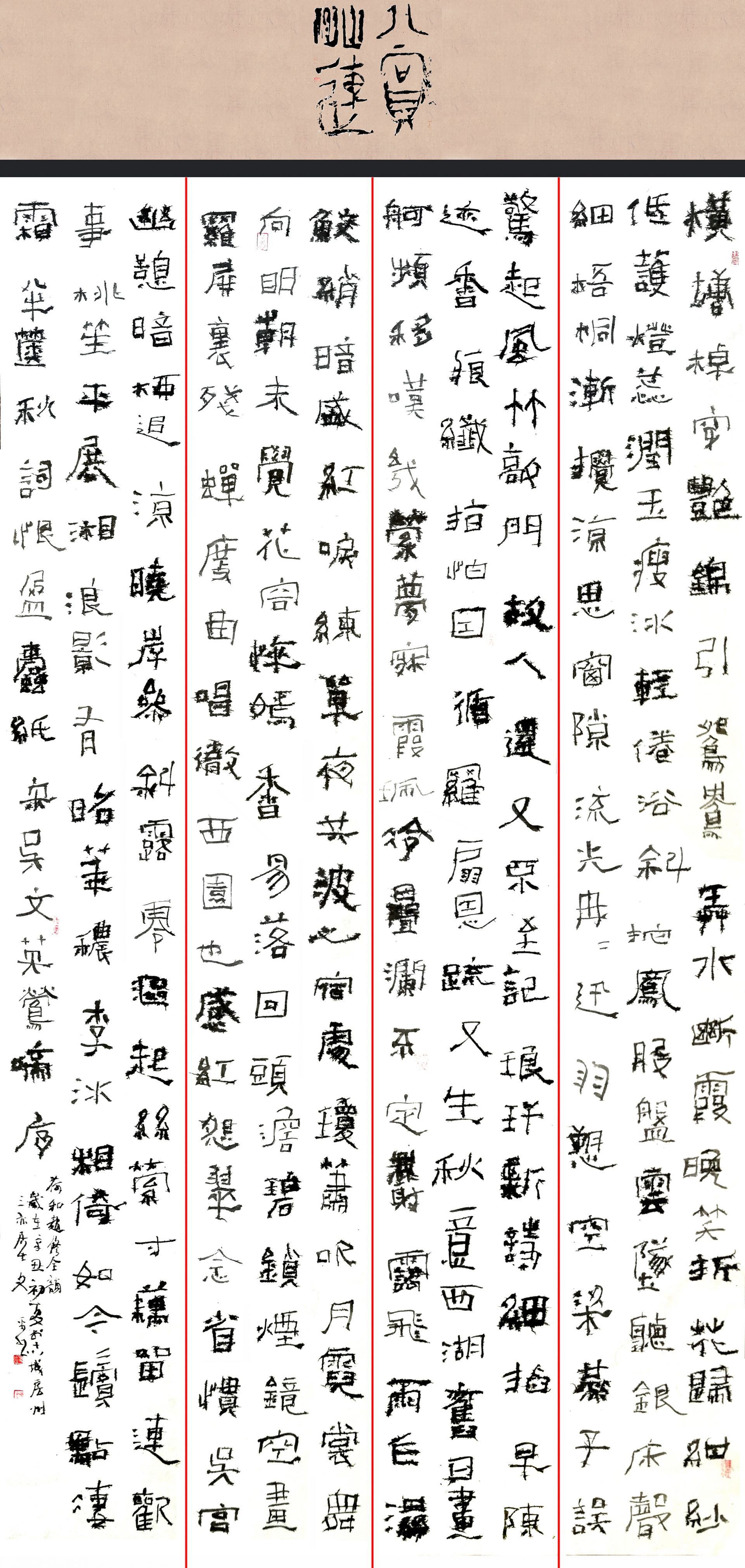 今日房縣網(wǎng)訊 通訊員 張立林 報道:9月27日,首屆“愛蓮杯”全國書法大展獲獎、入展名單公示,房縣孫文平創(chuàng)作的隸書〔宋代〕吳文英《鶯啼序·荷和趙修全韻》獲首屆“愛蓮杯”全國書法大展三等獎獲三等獎、創(chuàng)研經(jīng)費10000元。