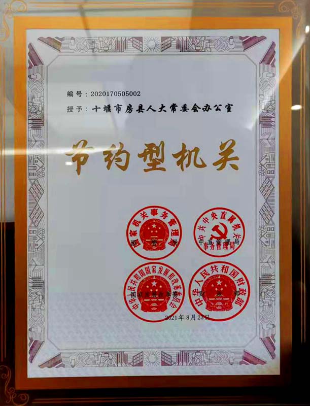 今日房縣網訊 記者代世旭 通訊員王萬軍 報道 日前,縣人大常委會辦公室收到國家機關事務管理局、中直管理局、國家發展改革委、財政部四個部委局聯合授予的“節約型機關”榮譽稱號。