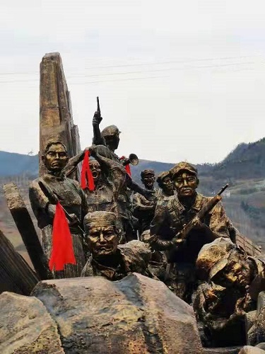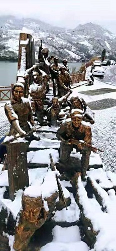 “強(qiáng)渡三道繩”群雕是為紀(jì)念1931年9月16日在大架巖戰(zhàn)斗中犧牲的40名紅補(bǔ)軍戰(zhàn)士和300 多名沖上三道繩索橋向敵人發(fā)動(dòng)進(jìn)攻的紅軍七十三團(tuán)戰(zhàn)士,被混入紅補(bǔ)軍內(nèi)部的大刀會(huì)匪徒突然砍斷索橋繩子,全部落入水中壯烈犧牲的英雄事跡。建設(shè)“強(qiáng)渡三道繩”群雕,表達(dá)了姚坪人民對(duì)黨的無(wú)比忠誠(chéng)和熱愛;寄托著姚坪人民對(duì)革命先烈的無(wú)限敬仰和追思;象征著姚坪人民對(duì)紅軍精神的繼承和發(fā)揚(yáng);展示了庫(kù)區(qū)兒女闊步前進(jìn)的豪情和壯志。