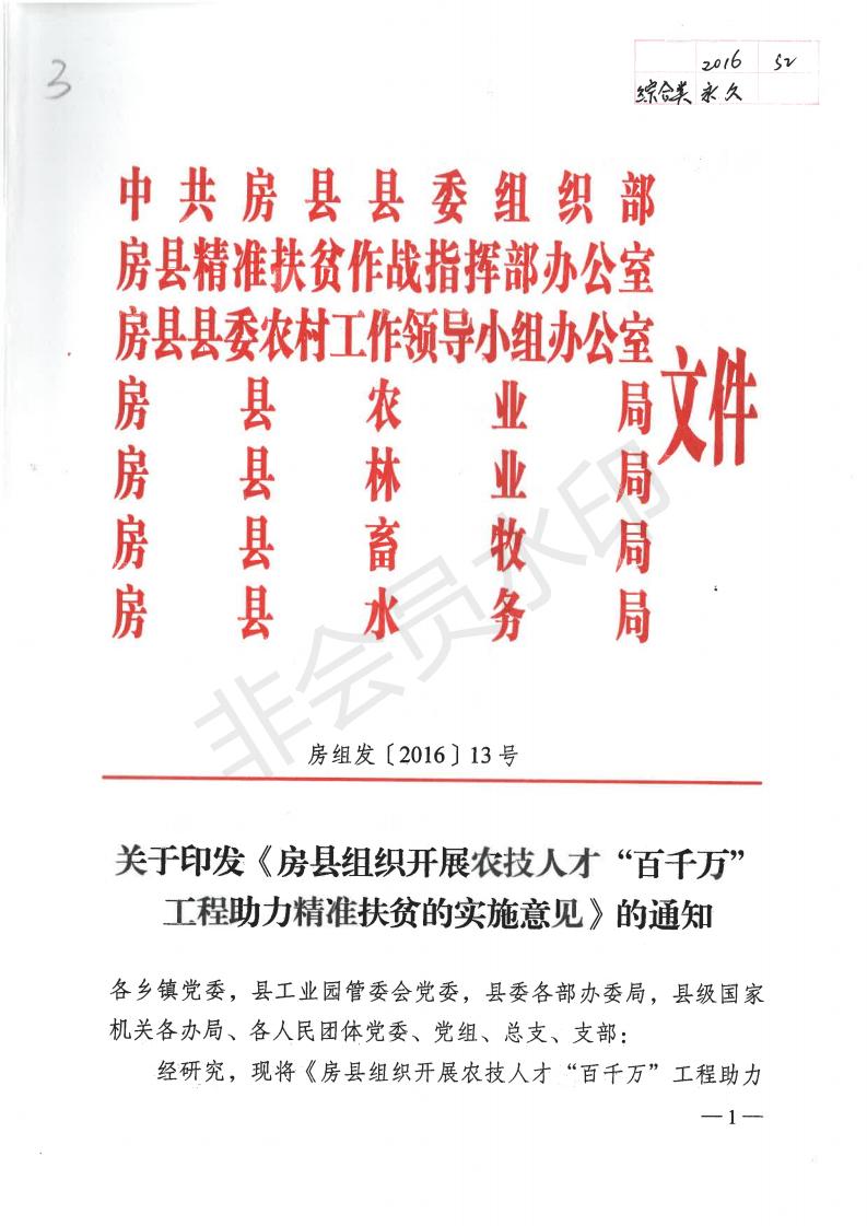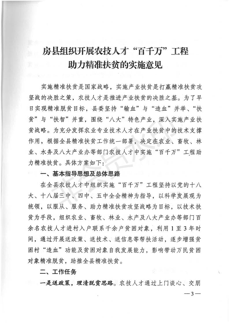 關于印發《房縣組織開展農技人才“百千萬”工程助力精準扶貧的實施意見》的通知-今日房縣網-- 房縣門戶