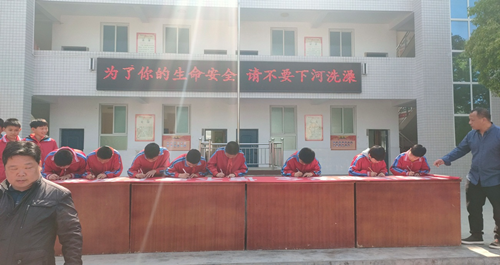啟動儀式上,學校安全管理員對全體師生進行防溺水安全教育,要求全體師生要深刻認識到溺水事故的危害,遠離危險地帶,避免溺水事故的發生。然后師生進行了“珍愛生命”的簽名活動。
