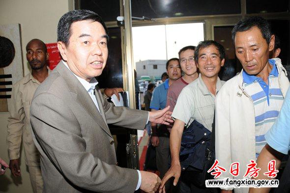 2012年1月30日,在蘇丹喀土穆國際機(jī)場,中國駐蘇丹大使羅小光(前左)迎接中水電集團(tuán)公司的部分員工。