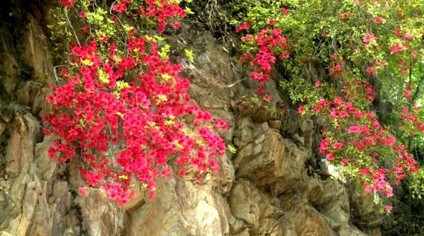 橙紅花朵點(diǎn)綴其間,鮮艷奪目,與周邊的巖石相互映襯,繪成一幅古色古香的畫卷。