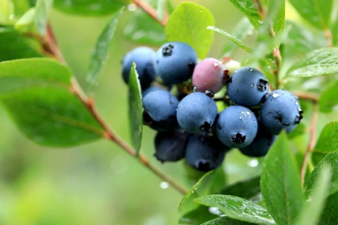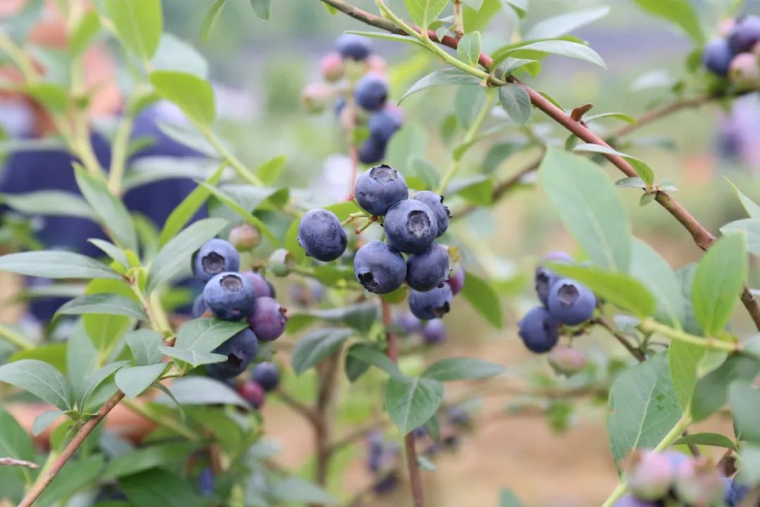 五月中下旬正是藍(lán)莓的掛果期,這里的藍(lán)莓樹上,都綴滿了珍珠般的藍(lán)果實(shí)。一串串藍(lán)紫色果實(shí)圓潤(rùn)可愛,外皮好似裹了一層糖衣,有一股純天然的清香,看起來十分誘人。