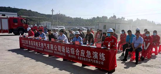 本次演練共分為信息報告與預(yù)警、指揮與協(xié)調(diào)兩個階段。演練以房縣同相天然氣有限公司綜合站工藝管道天然氣大量泄漏為設(shè)置場景,對站內(nèi)燃?xì)鈭缶⒕o急切斷、儲罐消防噴淋系統(tǒng)等自動控制功能與人員的應(yīng)急搶險技能進(jìn)行全面的檢驗。