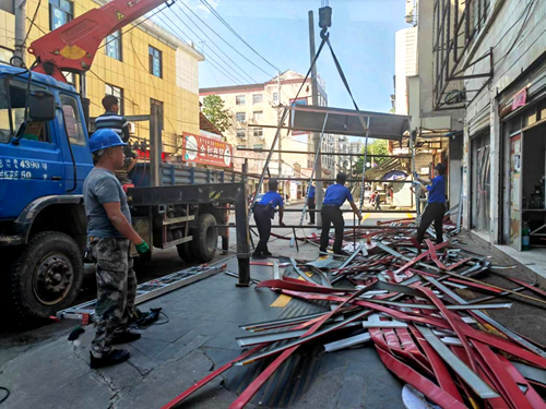 經過一周的摸排,整治專班將發現的700余處隱患點建立臺賬,按照危險等級進行分類處置,對存在破損、傾斜、脫落、松動、不符合設置規范等安全隱患的,向產權人下發限期整改通知書,要求其在規定時限內及時采取修復、加固等措施,并進行復查。對存在安全隱患的樓頂廣告招牌、達到設計使用年限的大型高立柱廣告、未按審批備案要求設置的戶外廣告設施招牌、無主戶外廣告設施招牌、垂直于建(構)筑物墻面設置的戶外廣告設施招牌,以及未經批準擅自設置的戶外廣告設施招牌,納入整治清單,統一組織由專業施工人員拆除。