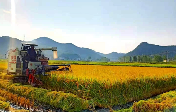 陽(yáng)光正好不溫不燥。早上9點(diǎn)多,人聲伴隨著水稻收割機(jī)的哄鳴聲在田野里響起,收割機(jī)在金色的稻田中來(lái)回穿梭,割稻、脫粒、粉碎稻桿等工序,一氣呵成。隨后,收割機(jī)將金黃飽滿的稻谷傾瀉而下,農(nóng)戶忙著裝袋上車,隆起的谷堆顯示著今年又是一個(gè)豐收年。不到一個(gè)小時(shí),村民老王3畝多的水稻就在“鐵牛”的幫助下,收割完畢。“以前我這3畝多的水稻人工大約三天的時(shí)間才能收完,現(xiàn)在用收割機(jī),真是省時(shí)又省力。”
