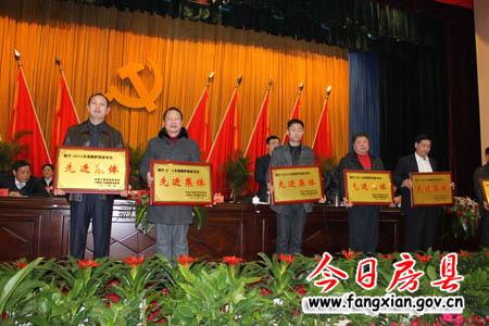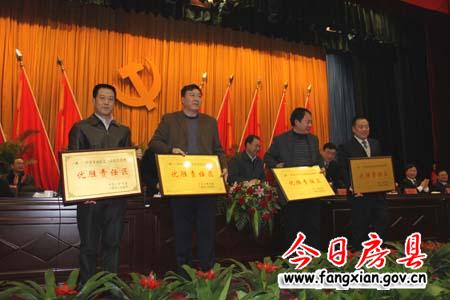 今日房縣網訊 通訊員朱曉東 方文 報道:2月28日,全市政法工作會議在市行政會議中心召開。房縣被市委、 市政府授予全市“社會治安綜合治理優勝責任區”和“維護國家安全工作先進集體”,市委書記陳天會為房縣頒獎,縣委常委、政法委書記杜啟學上臺領獎。