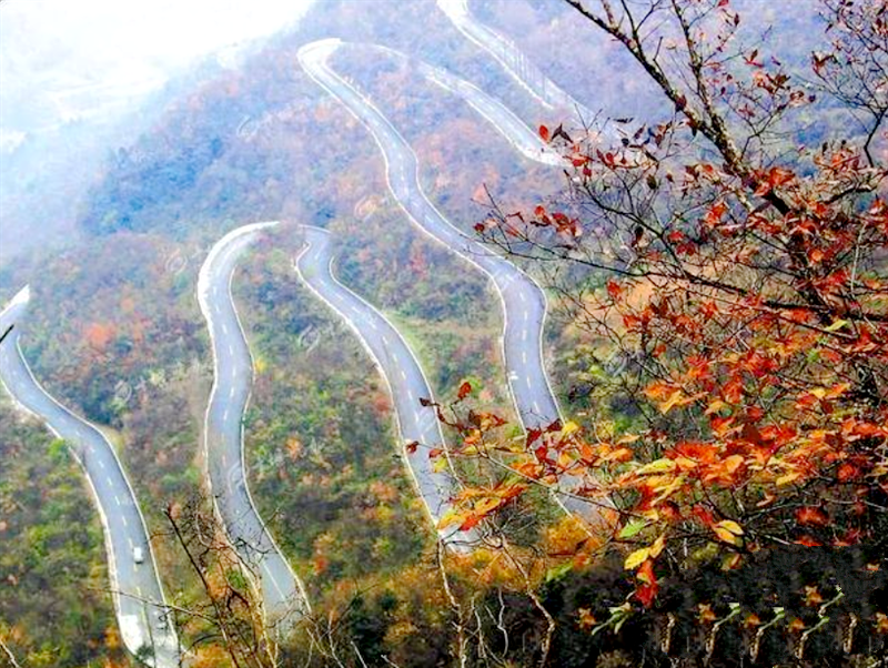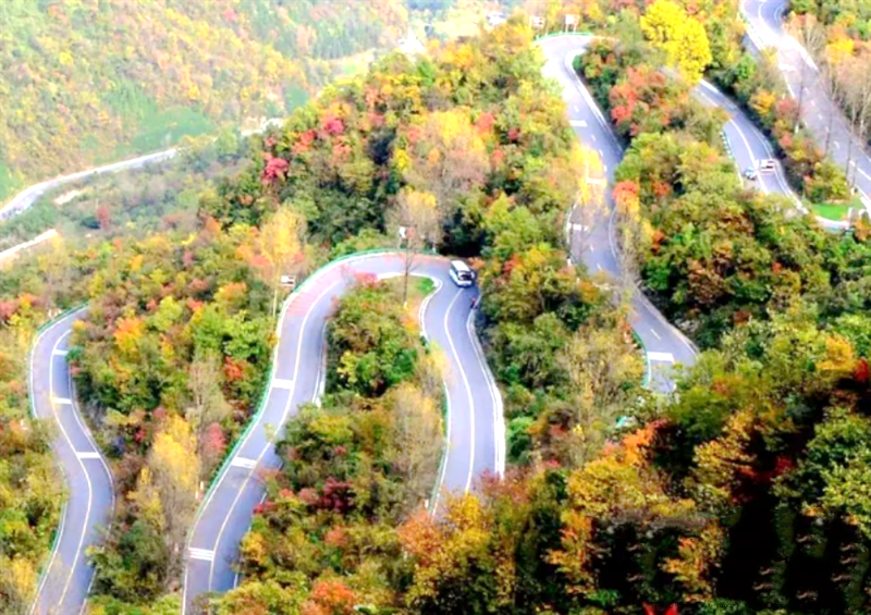 秋冬時節(jié)公路如絲帶般從谷底盤旋而上經過十道彎到達山頂,攀升高度超過百米公路兩旁層林盡染,五彩斑斕,美輪美奐