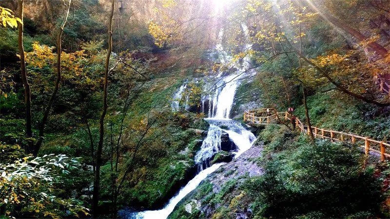 走進谷內,水清谷幽高峽平湖,讓人不禁贊嘆這奇觀異景最出名的是龍須瀑布水從懸崖頂一深潭中翻騰而出站在瀑布之下,頓時心曠神怡