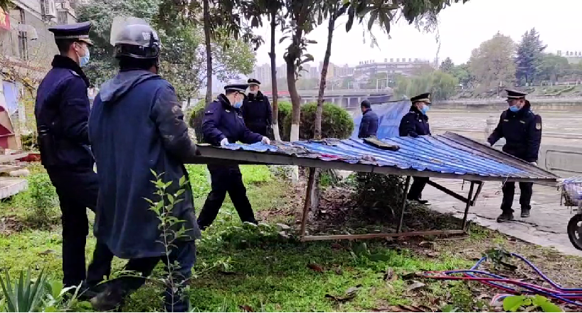 當日,房縣城區迎來了首場冬雪,氣溫也驟降至零下,但西河公園南側的親水走廊卻是一副熱火朝天的勞動景象。城鄉管理綜合執法大隊出動執法隊員15名,依法對沿河居民區內的私搭亂建進行拆除,清理破損門店廣告,整治店外占道經營行為,將亂堆亂放的雜物進行了徹底清理,環衛所組織12名環衛工人配合行動,對綠化帶“清臟治亂”。