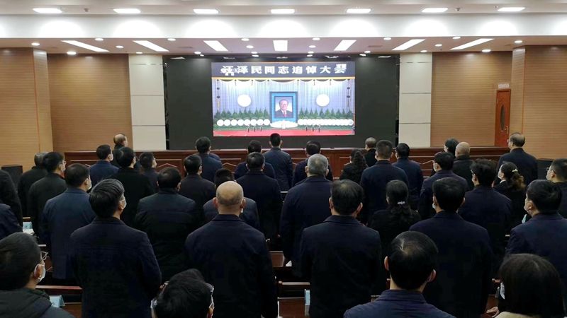 在詩經劇場,縣委書記紀道清,縣委副書記、縣長謝曉鳴,縣人大常委會主任高明哲,縣政協主席董詮聞等縣四大家領導身著深色服裝,神情肅穆,全程站立觀看江澤民同志追悼大會,默哀致敬,沉痛悼念江澤民同志。