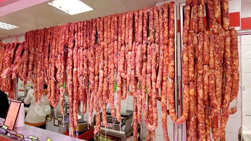在中百倉儲超市,記者注意到食品區(qū)內(nèi)早已擺放出色澤誘人的香腸臘肉,掛滿了各種臘味制品,前來選購的市民絡繹不絕。切肉、絞餡、調(diào)料、灌香腸,每年到了這個時候,中百倉儲超市的工作人員付慶芝就開始為市民提供免手工費灌香腸的服務。付慶芝說:“我們早上6點多就來上班,來了就開始灌香腸,這兩天買肉的也特別多,一天大約能灌個兩三百斤香腸。”