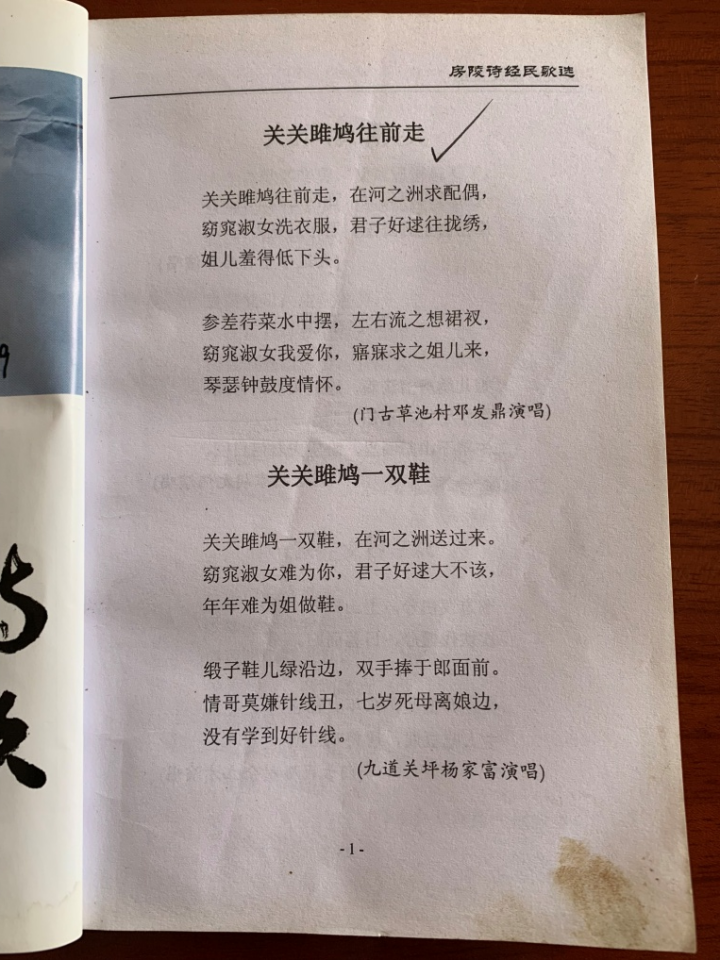 ? ? 鄧發(fā)鼎唱的民歌歌詞是這樣的:關(guān)關(guān)雎鳩往前走,在河之洲求配偶,窈窕淑女洗衣服,君子好逑往攏繡。