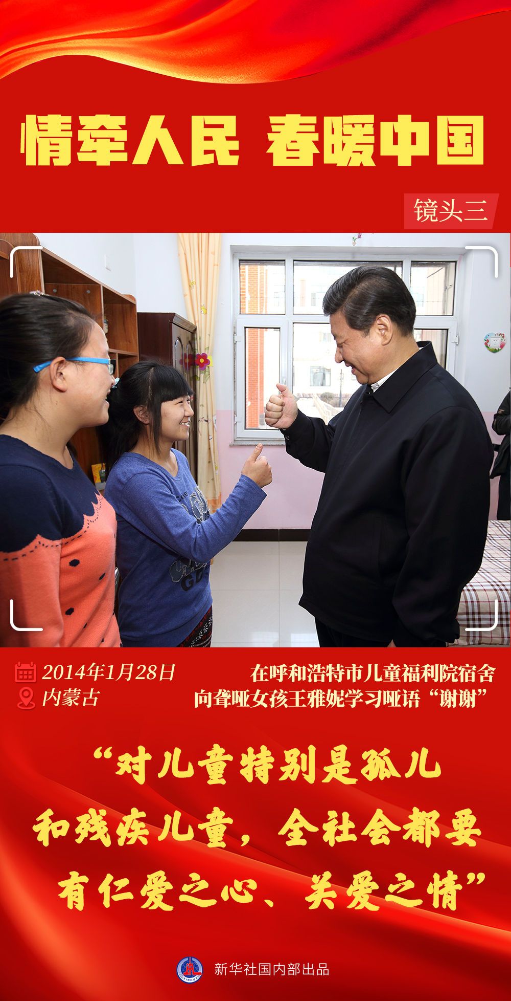 在呼和浩特市兒童福利院里,習(xí)近平總書記鼓勵聾啞女孩王雅妮好好學(xué)習(xí),學(xué)業(yè)有成。王雅妮向習(xí)近平總書記彎了彎大拇指,用啞語表示“謝謝”??倳浶θ菘赊涞厣斐鍪指鴮W(xué):“伸大拇指是‘好’,彎一彎是‘謝謝’?!睖厍榕c關(guān)愛盈滿斗室。