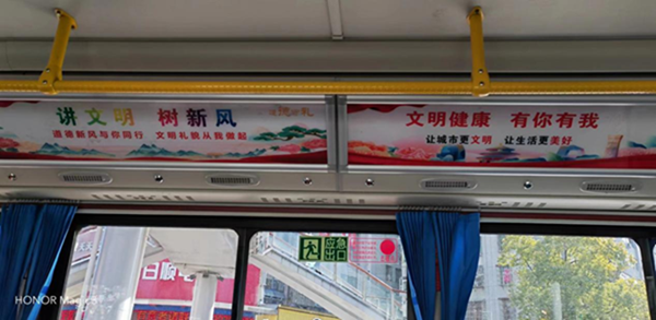 2022年底房縣城區(qū)綠色公交開通運營后,嶄新的車廂內(nèi)被主題鮮明、色彩絢麗的創(chuàng)文公益廣告裝飾得賞心悅目。內(nèi)涵創(chuàng)文公益廣告的公交車成為古城房陵流動的文明風景線。