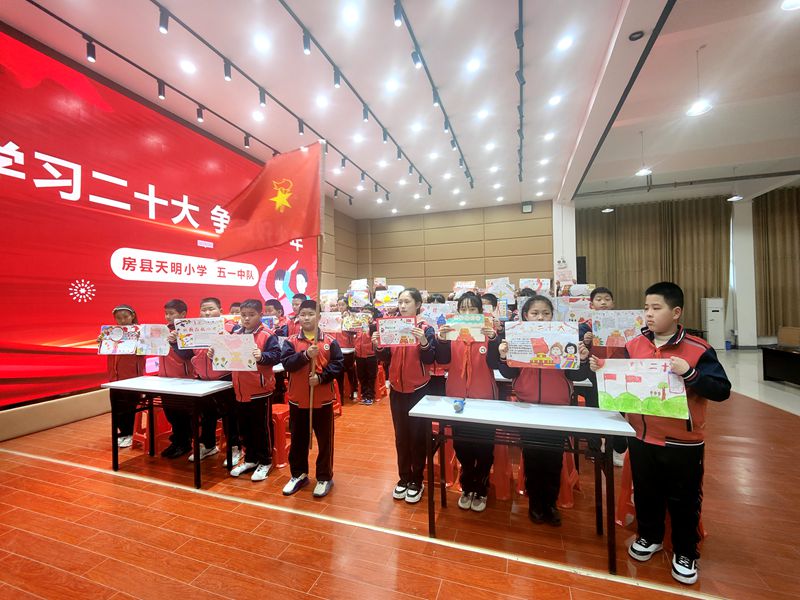 在天明小學隊會課上,老師正播放《非凡十年》微視頻等視頻,帶領學生深刻感受中國正發生的翻天覆地的變化,為學生講解中國十年來具有重要意義的三件大事。課堂最后,學生高舉自己繪制的以黨的二十大精神為主題的手抄報,表達新時代少年的美好愿景,努力成為共產主義事業的建設者和接班人。