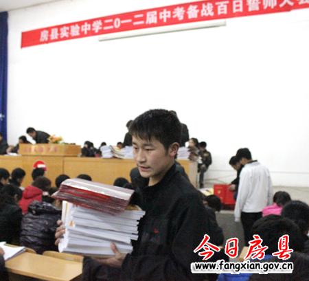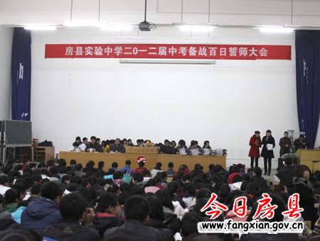 今日房縣網(wǎng)訊 見習(xí)記者劉臣 通訊員付傳斌 報(bào)道:20日,縣實(shí)驗(yàn)中學(xué)2012中考備戰(zhàn)百日誓師大會在該校大禮堂召開,該校596名初三學(xué)生向中考發(fā)起百日沖刺行動。