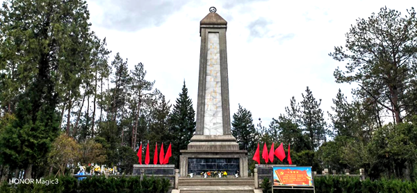 陵園內(nèi)山峰聳峙、蒼松挺拔。巍峨的烈士英雄紀(jì)念碑莊嚴(yán)肅穆。紀(jì)念碑兩旁,紅旗隨風(fēng)招展。那鮮艷的紅色,寓示著英烈用鮮血染成。紀(jì)念碑前面和左側(cè)擺放著鮮花和花籃,寄托著對(duì)英勇獻(xiàn)身革命先烈的崇高敬意和深切哀思。