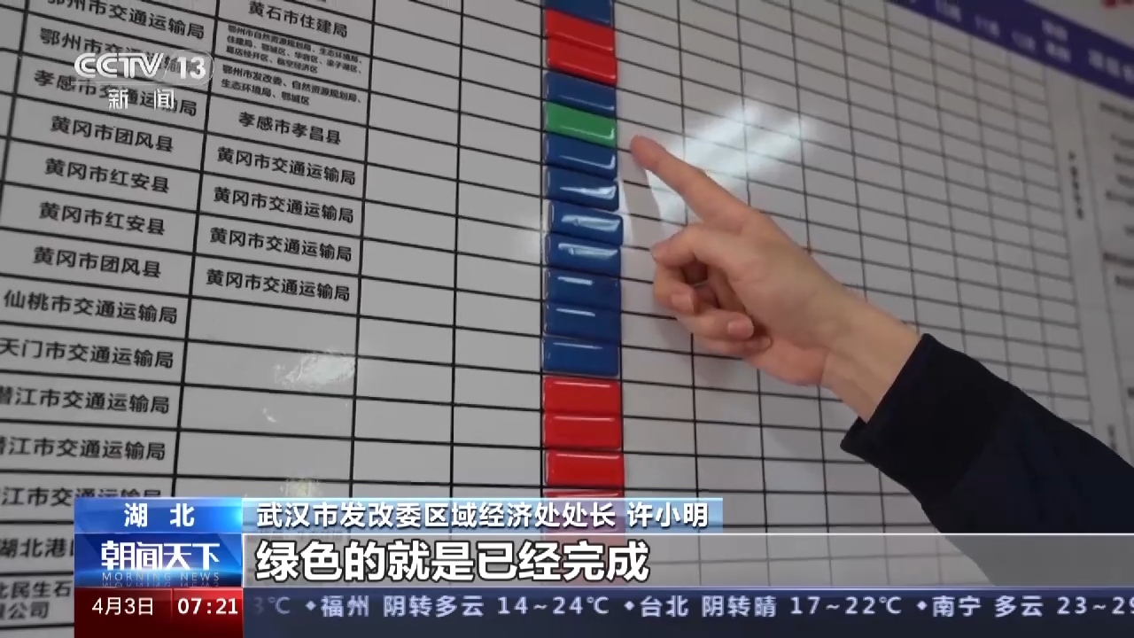 武漢市發(fā)改委區(qū)域經(jīng)濟(jì)處處長(zhǎng) 許小明:紅色屬于項(xiàng)目前期還沒(méi)有啟動(dòng),藍(lán)色是正在推進(jìn),綠色是已經(jīng)完成的。我們的設(shè)想是通過(guò)規(guī)劃同編、交通同網(wǎng)、科技同興、產(chǎn)業(yè)同鏈、民生同保這“五同”發(fā)展,加快把“武漢都市圈”打造成為引領(lǐng)湖北、支撐中部、輻射全國(guó)、融入世界的重要增長(zhǎng)極。