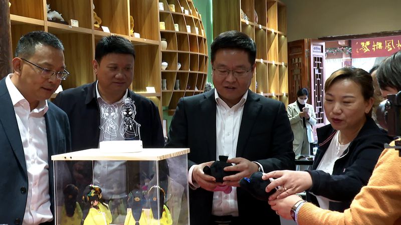 在房縣文旅農(nóng)創(chuàng)產(chǎn)品展示中心,“房小陵”“詩小雅”、耳菇、黃酒等一批房縣原創(chuàng)文創(chuàng)、旅創(chuàng)、農(nóng)創(chuàng)產(chǎn)品分區(qū)排列,這些產(chǎn)品用藝術(shù)的手法,將房縣詩經(jīng)、黃酒、野人三張“名片”有機(jī)融合,彰顯了房陵文化的獨(dú)特魅力。謝曉鳴來到各個(gè)展區(qū),了解產(chǎn)品設(shè)計(jì)創(chuàng)意、市場銷售等情況。