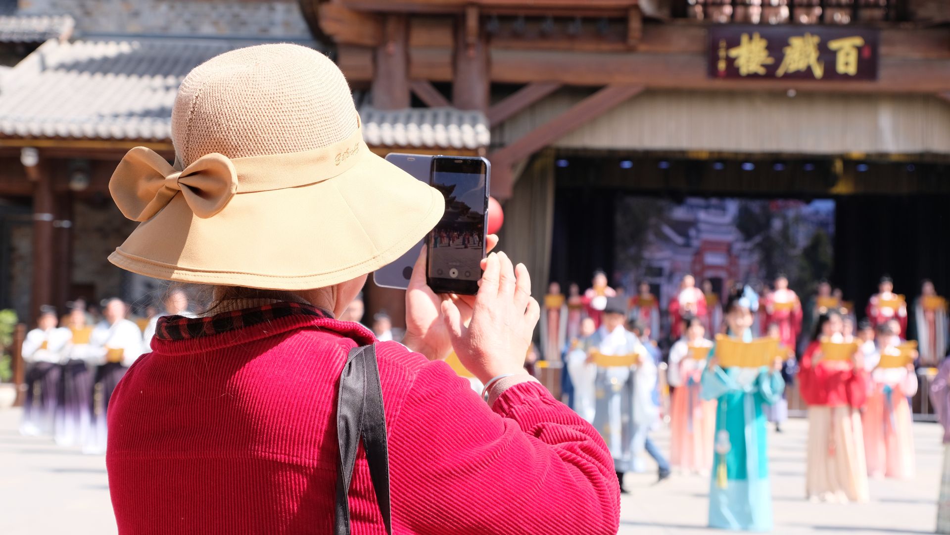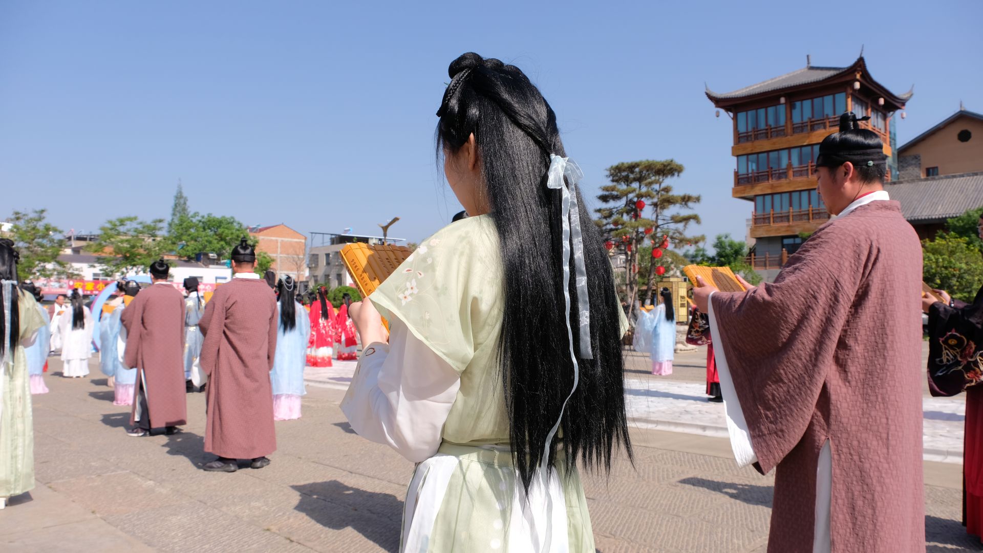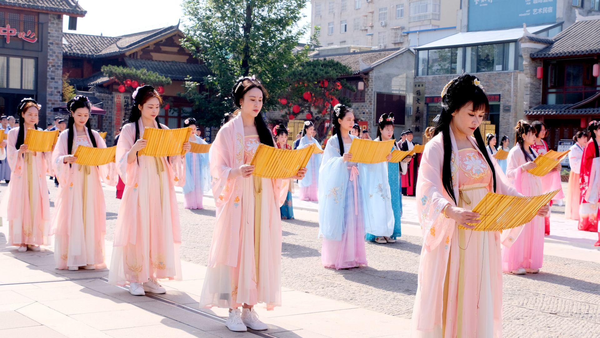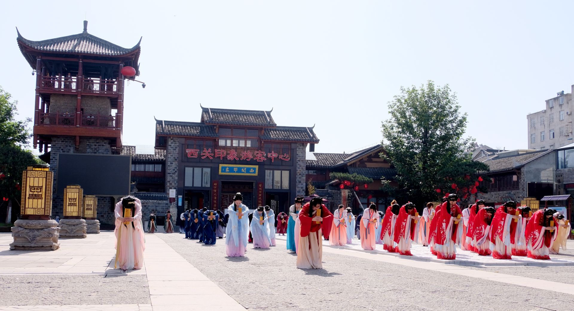 上午9時(shí),現(xiàn)場(chǎng)人員著不同系列的漢服在西關(guān)印象·周南廣場(chǎng)舉行周禮迎賓儀式,儀式再現(xiàn)了“禮樂安邦”的恢弘場(chǎng)景,通過場(chǎng)景化的方式帶領(lǐng)現(xiàn)場(chǎng)游客們沉浸式感受千里房縣·詩(shī)酒遠(yuǎn)方的美好意境。