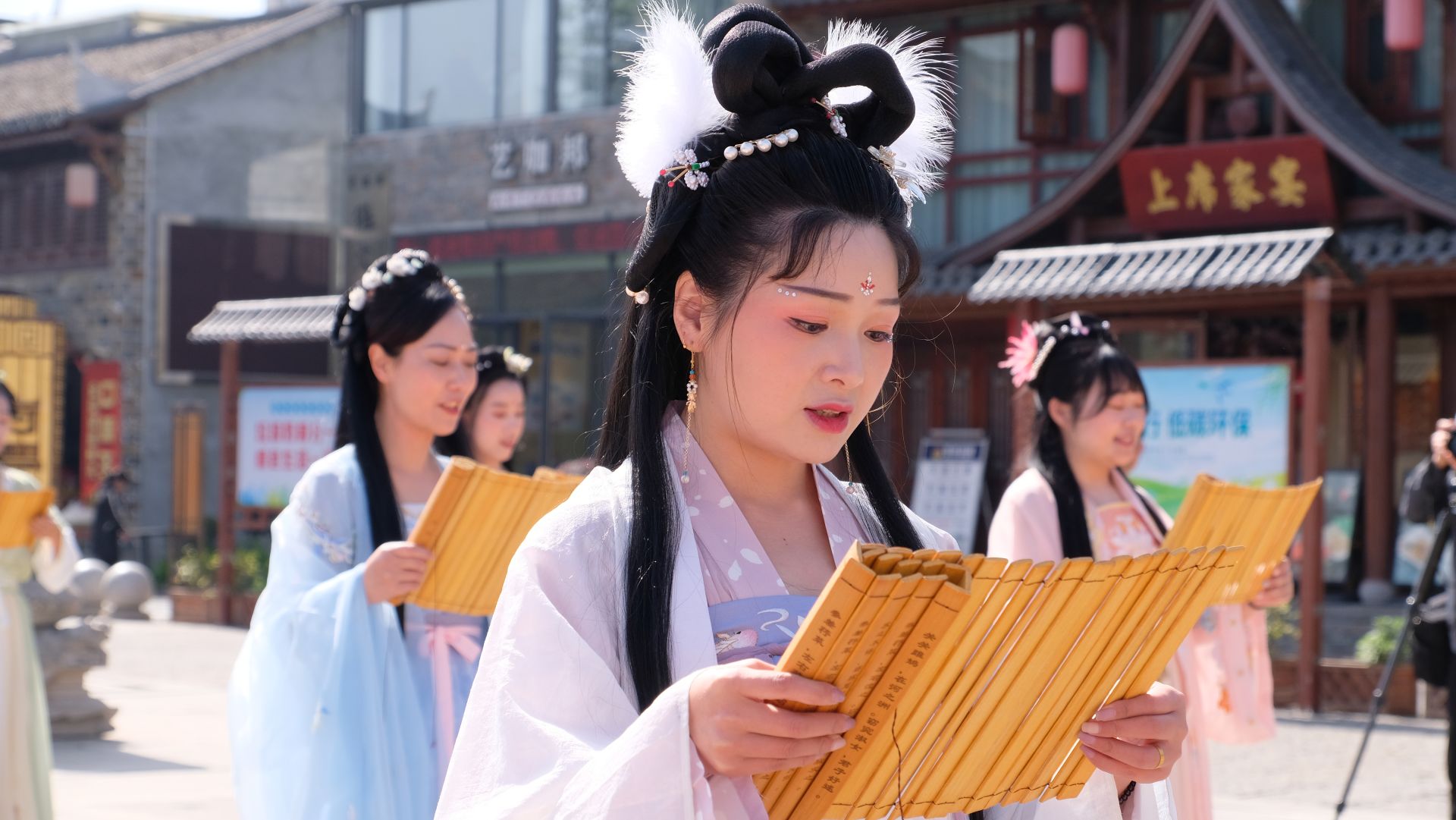 “關(guān)關(guān)雎鳩,在河之洲。窈窕淑女,君子好逑……”在西關(guān)印象周南廣場(chǎng)、百戲樓、川陜鎖鑰、三觀臺(tái)、詩(shī)經(jīng)廣場(chǎng)區(qū)域,表演人員手持竹簡(jiǎn),共同吟誦《詩(shī)經(jīng)》中的名篇《關(guān)雎》《鹿鳴》《蒹葭》篇章,演繹著詩(shī)經(jīng)的唯美浪漫。