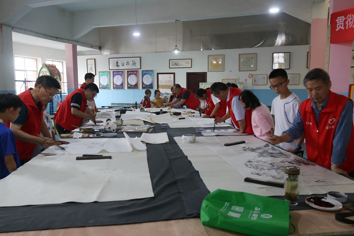活動中,房縣書協(xié)、美協(xié)志愿者為師生宣講中華優(yōu)秀書畫常識和詩經(jīng)文化、創(chuàng)作贈送書畫作品,對美名揚教育培訓(xùn)學(xué)校展出“詩經(jīng)”主題作品展給予輔導(dǎo),受到師生熱情歡迎!讓美名揚教育培訓(xùn)學(xué)校的兒童渡過了一個意義非凡的兒童節(jié)。“聽姜照輝伯伯講詩經(jīng)后,我才知道詩經(jīng)原來還有這么多教我們做人的道理……,這么多老師為我們創(chuàng)作鼓勵的書畫作品,六一節(jié)太開心了!”能背幾首詩經(jīng)的曹沐馳小朋友高興說道。