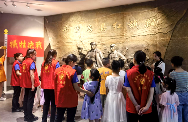 在“千里房縣紅旗飄”紅色文化展覽區(qū),志愿者和孩子們認(rèn)真聆聽解說員講述那段艱苦卓絕的歲月,仔細(xì)瞻仰了展廳內(nèi)的圖片和實(shí)物。一件件珍貴文物、一張張珍貴照片、一段段感人故事和一個(gè)個(gè)復(fù)原場(chǎng)景,重現(xiàn)了老一輩無產(chǎn)階級(jí)革命家在極端艱苦的條件下,緊緊團(tuán)結(jié)和依靠廣大人民群眾,創(chuàng)建人民軍隊(duì)、開辟革命根據(jù)地、建立紅色政權(quán)的崢嶸歲月。講解員帶領(lǐng)大家回顧了土地革命時(shí)期、抗日戰(zhàn)爭(zhēng)時(shí)期和解放戰(zhàn)爭(zhēng)時(shí)期革命先烈們不怕犧牲、英勇奮戰(zhàn)的先進(jìn)事跡,了解了賀龍率紅三軍在房縣英勇斗爭(zhēng)的革命歷程,學(xué)習(xí)了房縣革命烈士李明銓、雷天明、喬三元和葉八奶奶等感人事跡,深刻感悟了房縣共產(chǎn)黨人和革命群眾不怕流血、無所畏懼的精神。