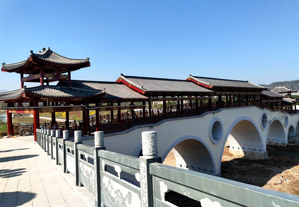 橋身設(shè)計(jì)共有五跨,36根樁基,6個(gè)承臺(tái)和墩臺(tái),5個(gè)拱圈,全部采用鋼筋混凝土澆筑。中間是一個(gè)拱形大橋洞,兩邊各有兩個(gè)對(duì)稱的拱形橋洞,橋洞頂上各有兩個(gè)圓形的小橋洞。平時(shí),河水從下面的大橋洞流過,漲水時(shí),河水還可以從上面的4個(gè)小橋洞流過,既減輕了流水對(duì)橋身的沖擊力,又減輕了橋身的重量,同時(shí)增加了橋梁的美感,三全其美,美美與共。主橋墩建造三跨式仿古廊道,兩側(cè)各建造一個(gè)重巖歇山觀景亭。橋梁上部的風(fēng)雨廊架,由重巖歇山觀景亭、爬山廊和長廊三部分組成,頂部皆鋪設(shè)高低錯(cuò)落、排列規(guī)整的雙坡黛瓦。