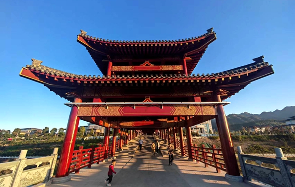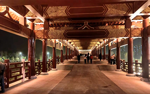 關(guān)雎大橋的廊廳結(jié)構(gòu)為大唐風(fēng)格,嚴(yán)整開朗,氣魄宏偉,體現(xiàn)出盛世繁華的輝煌面貌和卓越風(fēng)姿。紅色梁柱上純手工繪制的鎏金圖案,富麗生輝,流光溢彩,是優(yōu)秀傳統(tǒng)文明的精彩再現(xiàn),是古代華夏文化的開枝散葉。立柱、橫梁、頂棚、圍欄全部采用傳統(tǒng)美色中國紅。紅色是中華民族血液里永不褪色的赤誠,更是生活中熱鬧的底色,象征著傳承千年的福氣,映照著房縣光輝燦爛的美好明天。新時(shí)代新征程上,乘百舸爭流之勢,續(xù)房陵文化之脈,憶崢嶸歲月,看今朝輝煌,面朝大海,春暖花開。