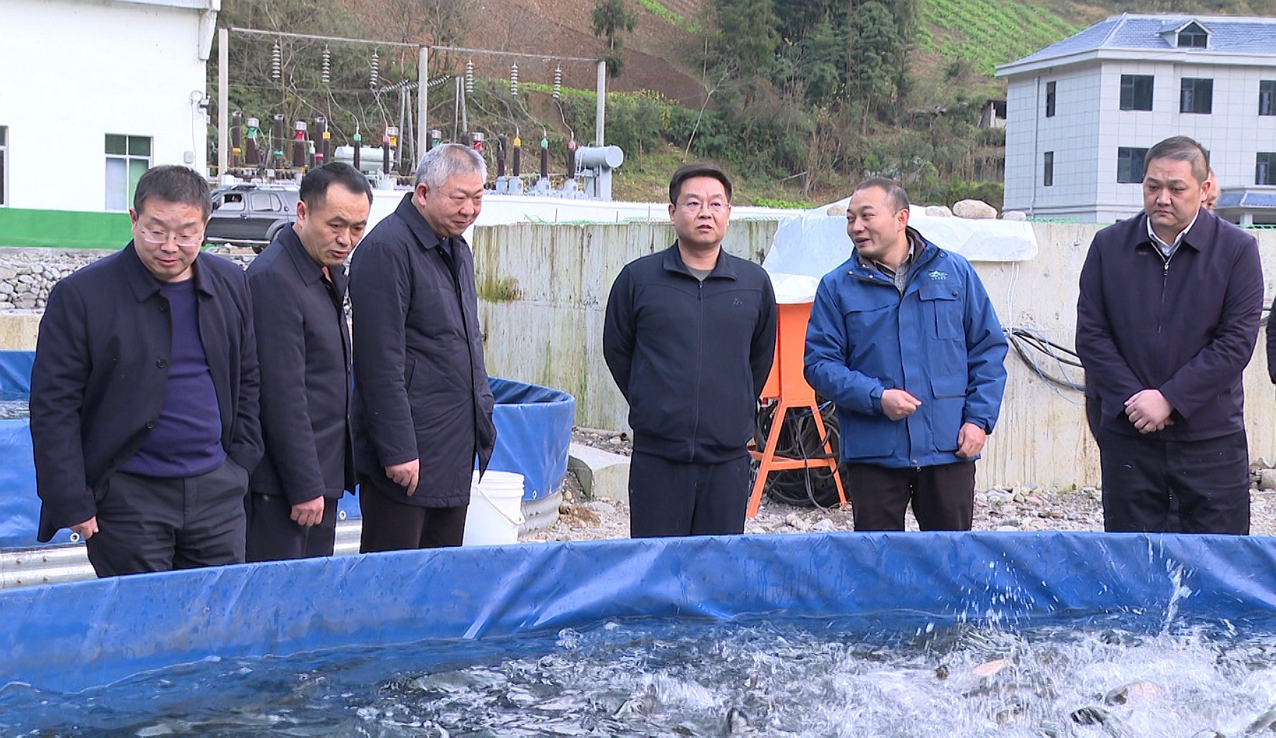 謝曉鳴一行在九道鄉(xiāng)瓦房坪村察看設(shè)施養(yǎng)魚