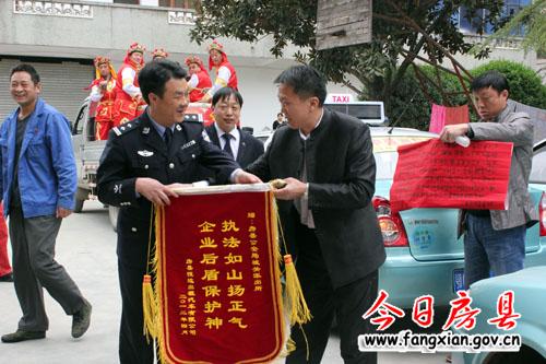 恒達(dá)出租車公司總經(jīng)理白金洲將錦旗送到城關(guān)派出所所長(zhǎng)手中