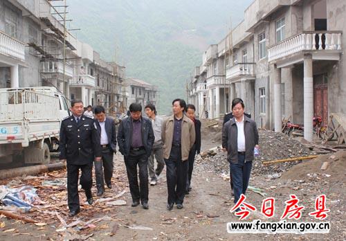 圖為縣委副書記張慧彬(右二)查看九道鄉(xiāng)義渡坪移民安置小區(qū)