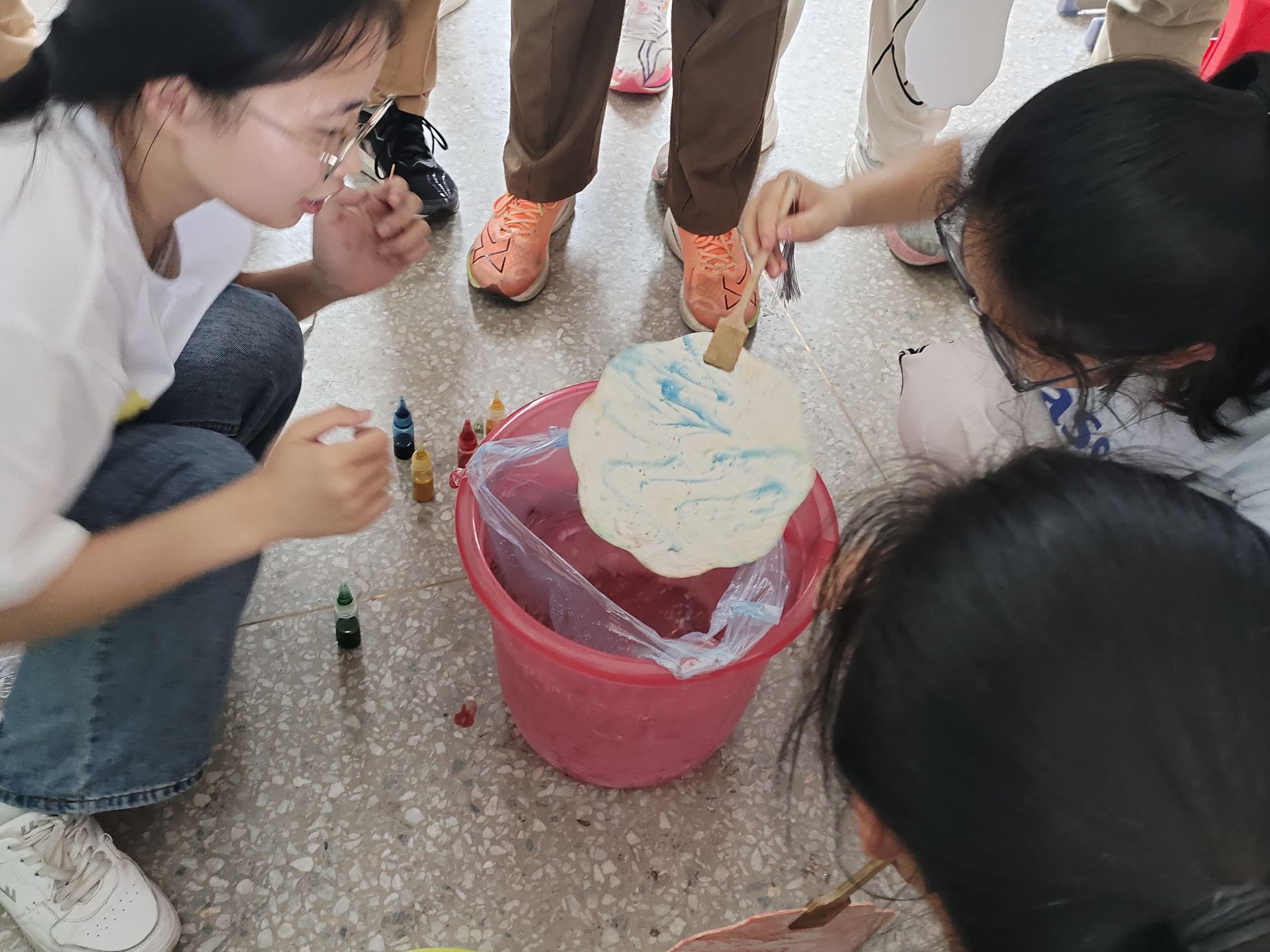 近兩周的日子里,支教團(tuán)隊(duì)精心準(zhǔn)備了多樣化的課程。他們引入了AI繪畫課程,讓孩子們通過簡單的操作創(chuàng)作出獨(dú)一無二的藝術(shù)作品;開展了主題為“人生拍賣會”的心理課,幫助同學(xué)們樹立正確的價(jià)值觀;將漆扇藝術(shù)帶入課堂,講解了漆扇繪制的基本技法、漆扇歷史、制作流程與色彩搭配,帶領(lǐng)同學(xué)們進(jìn)行漆扇制作;解讀了《清明上河圖》《千里江山圖》等作品,讓同學(xué)們真切感受到了中國古代繪畫之美和歷史的魅力;準(zhǔn)備了豐富生動的植物手工實(shí)踐類特色課程,指導(dǎo)同學(xué)們利用植物葉片制作拓染帆布包、苔蘚生態(tài)瓶和植物相框,激發(fā)了孩子們的創(chuàng)造力和動手能力;通過《英語趣配音》課程提升學(xué)生的口語水平,用《瘋狂動物城》《愛麗絲夢游仙境》等激發(fā)同學(xué)們的學(xué)習(xí)興趣,讓他們感受不同文化的碰撞與融合。此外還開設(shè)了籃球、乒乓球、排球、聲樂、器樂、舞蹈等課程,讓同學(xué)們在體育鍛煉中釋放壓力,在藝術(shù)熏陶下提升審美能力。