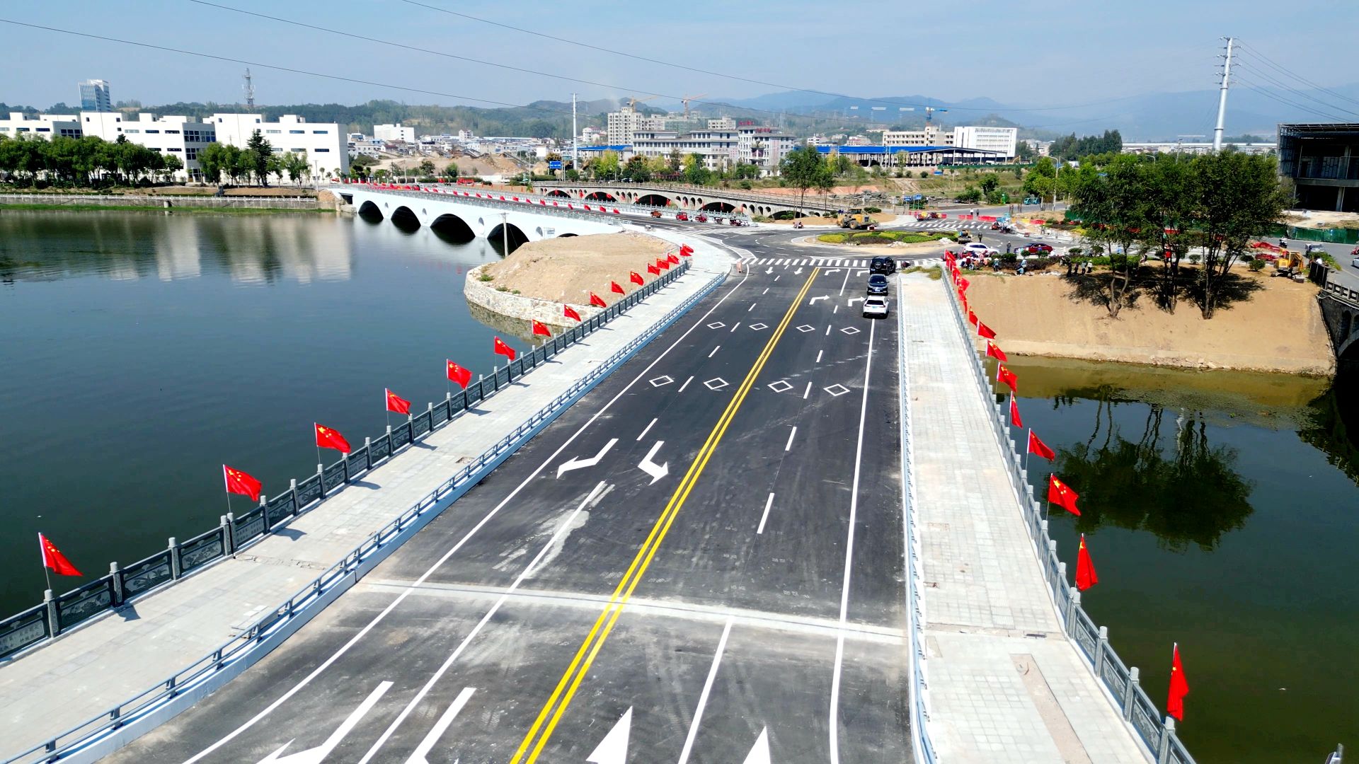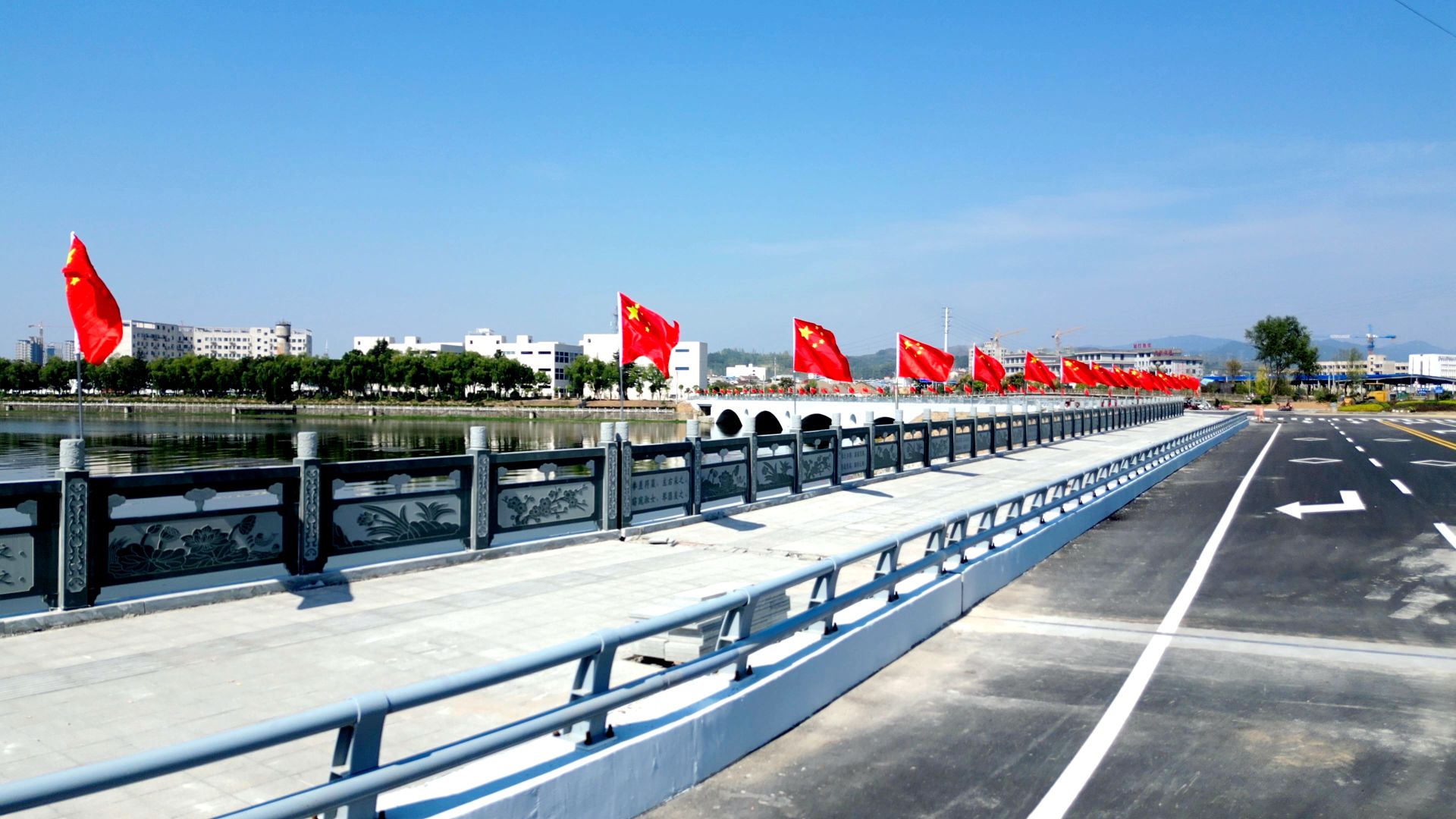 在城區(qū)白駒大橋、楊彼嶺大橋、沙溝河大橋,橋梁兩側(cè)的燈桿上整齊排列的五星紅旗正迎風飄揚,在陽光的映照下格外鮮艷,不僅扮靚了城區(qū),也營造出喜慶、祥和的節(jié)日氛圍,更激發(fā)了市民的愛國熱情和民族自豪感。