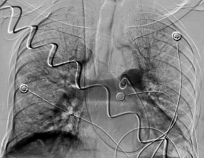 肺動(dòng)脈左右分支大量血栓(左邊血栓說明) 下腔靜脈大范圍血栓(濾器置入攔截)(右圖血栓說明)