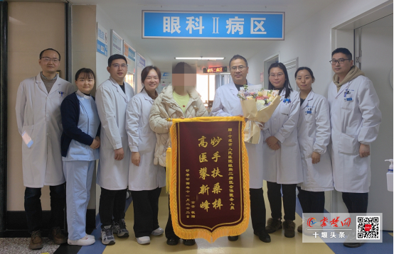 經(jīng)過十堰人醫(yī)眼科二病區(qū)醫(yī)護(hù)人員的精心治療和護(hù)理,郭女士的視網(wǎng)膜復(fù)位良好,晶體沒有受到影響,矯正視力達(dá)到了0.6。這一結(jié)果不僅讓郭女士重獲光明,也讓她的生活和工作恢復(fù)了正常。“真的非常感謝眼科二病區(qū)的全體醫(yī)護(hù)人員,他們的專業(yè)和細(xì)心讓我深受感動(dòng),在我最無(wú)助的時(shí)候,是他們?yōu)槲姨峁┝藥椭r(shí)時(shí)關(guān)心、安慰我,是他們讓我重見光明。”感激之余,郭女士將一面印有“妙手扶桑梓 高醫(yī)攀新峰”的錦旗送到眼科二病區(qū)。