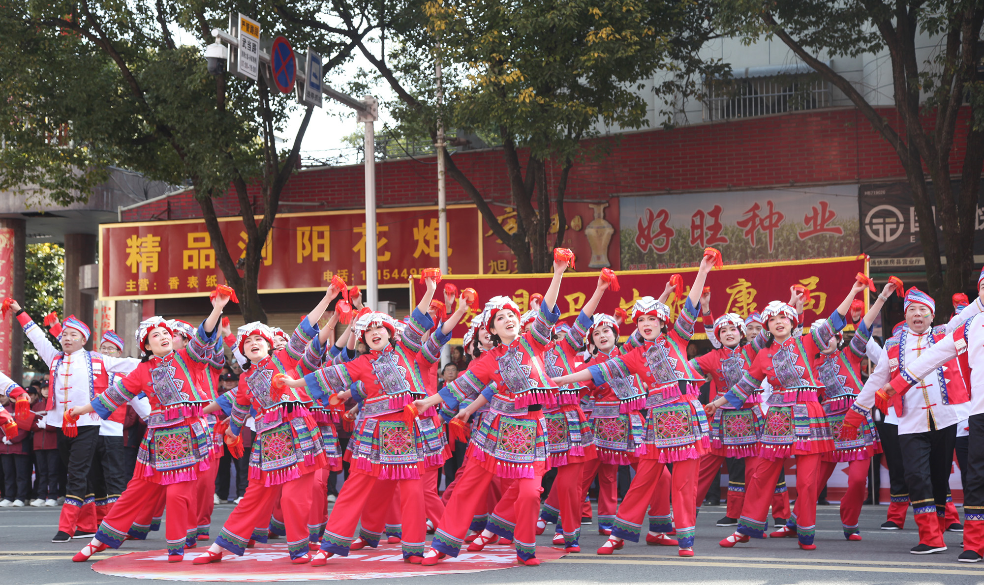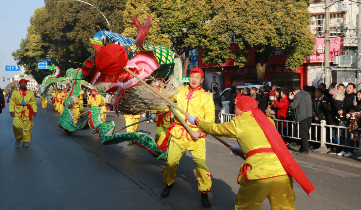走在巡游隊(duì)伍最前面的是由城關(guān)鎮(zhèn)民間藝人帶來的火龍表演,三條火龍?jiān)谛扈尮穆曋校舷路w,東騰西移,祈福新一年風(fēng)調(diào)雨順、五谷豐登。來自土城鎮(zhèn)、門古寺鎮(zhèn)、中壩鄉(xiāng)等鄉(xiāng)鎮(zhèn)的群眾也組織了豐富多彩的民俗節(jié)目參與到巡游活動(dòng)中,現(xiàn)場龍騰獅躍、熱鬧非凡。