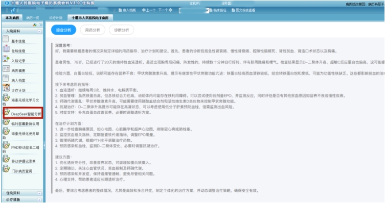 5日,在十堰人醫(yī)電子病歷系統(tǒng)管理后臺中,新增了DeepSeek智能分析功能。當輸入患者信息后,系統(tǒng)在不到一分鐘內(nèi)即完成數(shù)據(jù)整合,精準呈現(xiàn)患者的現(xiàn)病史、既往病史及檢查結(jié)果,并基于醫(yī)院積累的百萬級醫(yī)學(xué)數(shù)據(jù)庫,對病例進行綜合分析、用藥分析、診斷分析,為醫(yī)生提供初步診斷意見和治療建議。