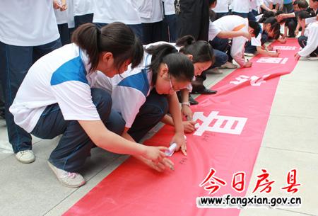 圖為縣實驗中學學生在題為“靚麗房縣 從我做起”的橫幅上簽名
