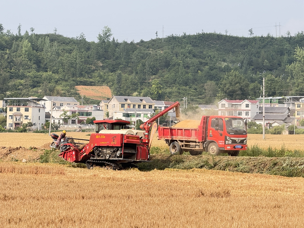 陽光中,連片的麥田泛起金色的波浪,一壟壟小麥穗大飽滿沉甸甸的,壓彎了麥稈。只見農(nóng)機(jī)手們駕駛著聯(lián)合收割機(jī)在麥田中穿梭,鋼鐵身軀吞吐間,飽滿的麥穗被卷入機(jī)械腹中,金黃的麥粒如流水般傾瀉進(jìn)農(nóng)用車車廂,運(yùn)往晾曬場進(jìn)行晾曬。