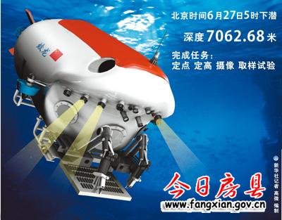 6月27日,在第二次的7000米深度——7062米的海底,“蛟龍”再次完成了坐底、水體取樣、沉積物取樣、標(biāo)志物布放、攝像、照相、高精度海底地形測量等深海調(diào)查作業(yè),全面驗(yàn)證“蛟龍”的設(shè)計(jì)指標(biāo)和功能性能,證明這是一條可堪重任的“中國深海蛟龍”。