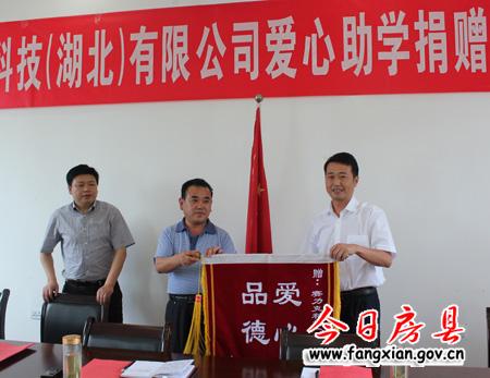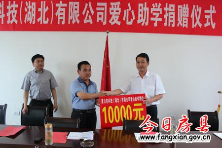 圖為白鶴鎮(zhèn)書記蘇文星、鎮(zhèn)長林云國接收賽力克科技(湖北)有限公司董事長董文雅(中)的捐贈愛心助學款1萬元。