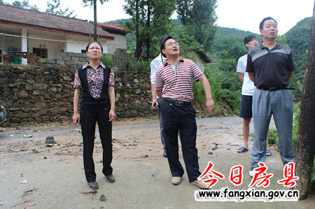 圖為萬峪河鄉(xiāng)黨委書記宋爽(左一)、鄉(xiāng)長田茂成(中)等領導在災區(qū)視察指導