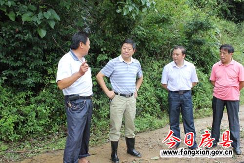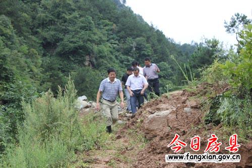 圖為王啟云一行察看白鶴鎮(zhèn)冷水溝道路受損情況