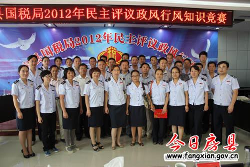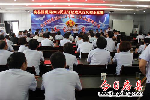 今日房縣網訊 記者陳銳 通訊員黨天成報道: 31日,縣國稅局舉行2012年民主評儀政風行風知識競賽,縣國稅局局機關、稽查局、城區分局、軍店所、野人谷所、青峰所六支代表隊參加比賽。比賽由國稅局行評監督員擔任評委,百余名國稅干部職工現場觀看了比賽。