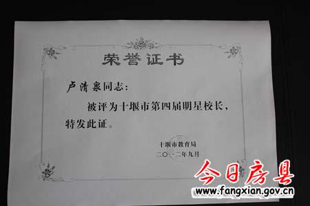 近日,十堰市教育局在縣教育局層層推薦嚴格考核的基礎上,組織專家評審委員會經層層篩選,東城小學校長盧清泉被十堰市教育局評為“十堰市第四屆明星校長”,躋身全市十所中小學明星校長之一。