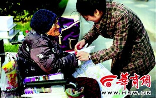 11月6日,十堰女孩李宇寧在西安市南門外遇到一位92歲擺地?cái)偟睦夏棠蹋粗先嗽诤L(fēng)中凍得瑟瑟發(fā)抖,李宇寧趕緊掏錢買了份老人賣的地圖,還將自己的手套給老人戴上,而這一幕正好被華商報(bào)記者拍下來。新浪微博@新浪拍客以《路過女孩為陌生擺攤老人戴上手套》為題發(fā)了一條微博,網(wǎng)友紛紛轉(zhuǎn)發(fā),稱她是“西安最美女孩”。昨日,本報(bào)記者輾轉(zhuǎn)聯(lián)系上華商報(bào)記者葉原和“感動(dòng)西安”的十堰女孩李宇寧,了解照片背后的感人故事。