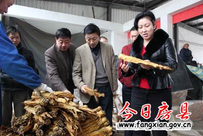 圖為林華(右一)在九道鄉(xiāng)煙站察看煙葉收購情況